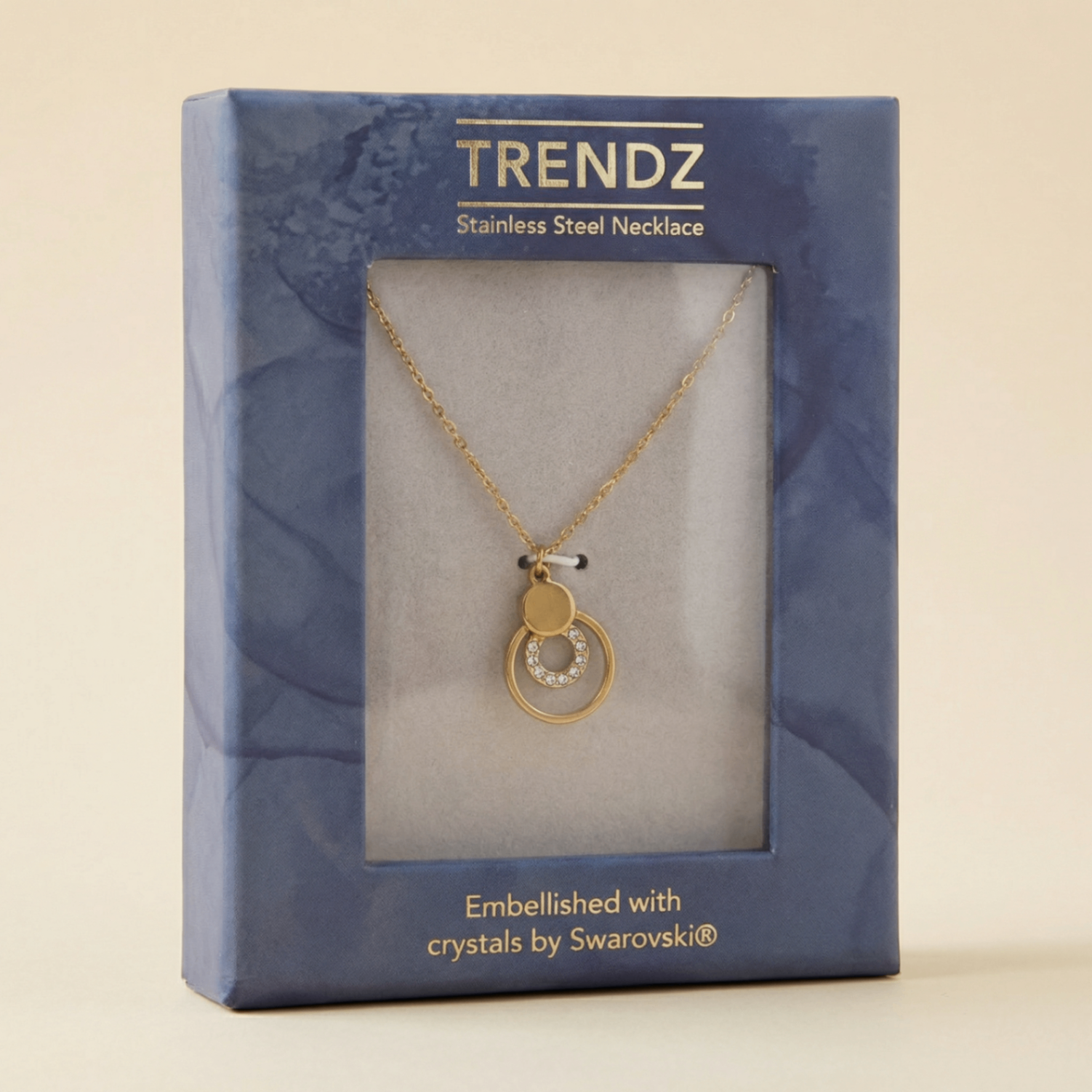Zarafeti modern bir dokunuşla birleştiren Trendz Swarovski® kristalli çift halka kolye, iç içe geçen dairesel formuyla şıklığı sade bir çizgide sunar. Işıltıyı abartmadan yansıtan Swarovski® kristalli iç halka, günlük kombinlerden özel davetlere kadar her stile kolayca uyum sağlar.